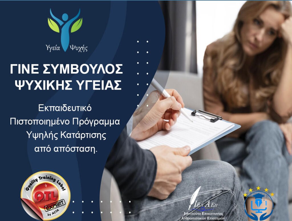 Το Πιστοποιημένο Εκπαιδευτικό Πρόγραμμα “Υγεία Ψυχής” αποτελεί ένα ολοκληρωμένο και σύγχρονο πρόγραμμα επαγγελματικής κατάρτισης στη Συμβουλευτική Ψυχικής Υγείας, σχεδιασμένο για όσους επιθυμούν να δραστηριοποιηθούν ουσιαστικά και υπεύθυνα στον ταχέως αναπτυσσόμενο τομέα της ψυχικής υγείας.